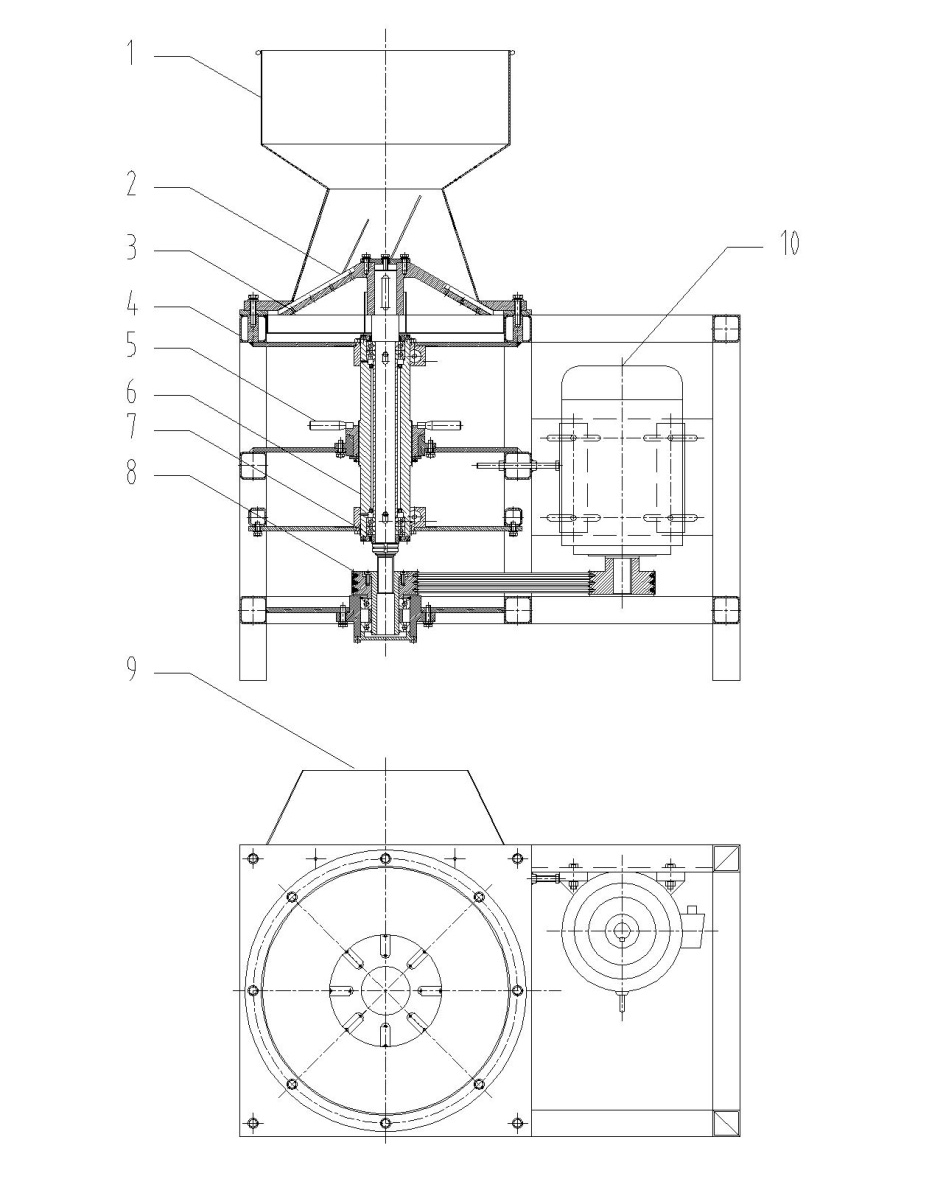 1、進(jìn)料斗;2、齒刀片;3、刀盤;4、機(jī)架;5、轉(zhuǎn)子升降機(jī)構(gòu);6、軸承架;7、軸承;8、皮帶傳動(dòng)機(jī)構(gòu);9、出料斗;10、電機(jī)