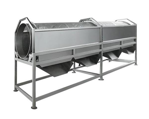 水果分級機是由分選安排、傳動安排和電動機組成。 水果分選時將生果運送至進 料斗,然后流入到分級滾筒或搖晃篩中,使水果在滾筒里滾轉和移動或在搖晃篩中作相對運動,并在此過程中通過相應的孔流出,以抵達分級目的。