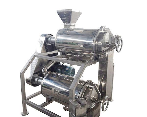 全自動番茄打漿機:電動機通過皮帶傳動,使安裝在花鍵上的刮板高速旋轉,當經過破碎的水果通過進料口進入機內時,接漿盤就把物料均勻排發到刮板和篩網處。由于刮板的回轉作用和導程角的存在,使物料沿著圓筒向出口端移動,移動的軌跡呈螺旋狀,物料就在刮板和篩筒之間移動過程中受離心力的作用而被擦碎,汁液和肉質(已成漿狀)從篩孔中通過送入下道工